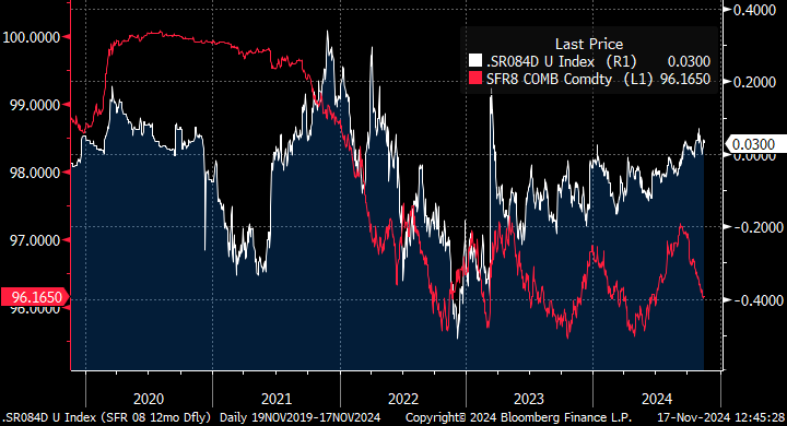In the last 18 months, we have had a 100+bp selloff in SFR8, followed by a 100+bp rally, followed by a 100+bp selloff, followed by a 100+bp rally and followed most recently by a 100+bp selloff (see red line on the chart). In that time, the range of the year double fly has just gotten narrower and narrower (white line on the chart). This is what I meant when I said there is a noticeably larger algo presence this year than in the past. This is NOT how the double fly “should” trade with respect to major rate level changes. But this is the environment we find ourselves in.